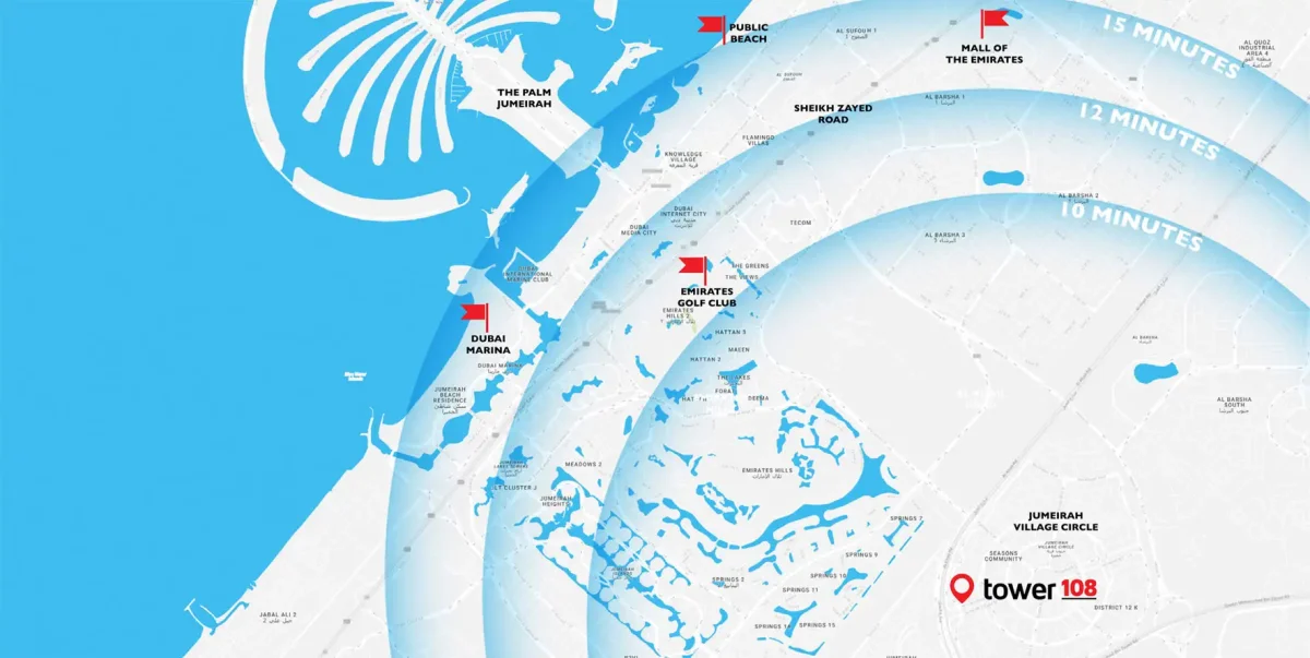 Tower 108 is located in the heart of Jumeirah Village Circle, offering easy access to the nearby road network via Sheikh Mohammed Bin Zayed Road and Al Khail Road. JVC is a thriving community offering a modern lifestyle and a wide range of amenities.
