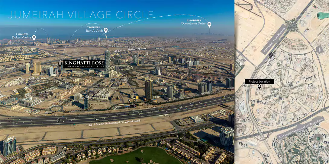 Binghatti Rose is located in the heart of Jumeirah Village Circle (JVC), Dubai, providing residents with connections to all key points of the city. Stay connected to the rest of Dubai thanks to its proximity to the main Al Khail Road and Sheikh Mohammed Bin Zayed Road. Meanwhile, your neighborhood will further enhance your lifestyle with its business districts designed for a sophisticated new age lifestyle.