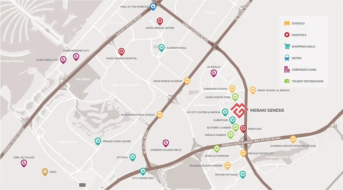Located in Al Barsha, Dubai, Genesis Residences offers easy accessibility and mobility, giving you easy access to various key attractions. With its close proximity to the road network, you can easily access Sheikh Mohammed Bin Zayed Highway, Al Hail Road and Umm Sukeim Road. Residents can access various key attractions including Al Maktoum International Airport, Dubai Marina, Miracle Garden, Mall of Emirates and many more.
