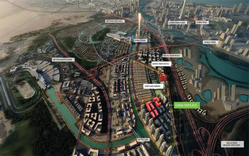 Sobha Hartland Greens is located in Mohammed Bin Rashid (MBR) Al Maktoum City, Dubai, with easy access to Ras Al Khor Road and Dubai Ain Road. It is just minutes away from the major attractions of Dubai, while offering an ideal location for extravagant living with key access to the Dubai Canal, Dubai Creek, Dubai Mall, Downtown Dubai, Meydan One Mall and Meydan Racecourse.