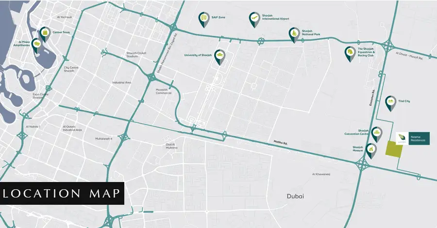 Nasma Residences by Arada's first-class location in the suburb of Al Tay, Sharjah, gives residents easy access to major attractions. It is located at the intersection of Emirates Road and Malikha Road, close to Tilal Mall and Sharjah Convention Center.