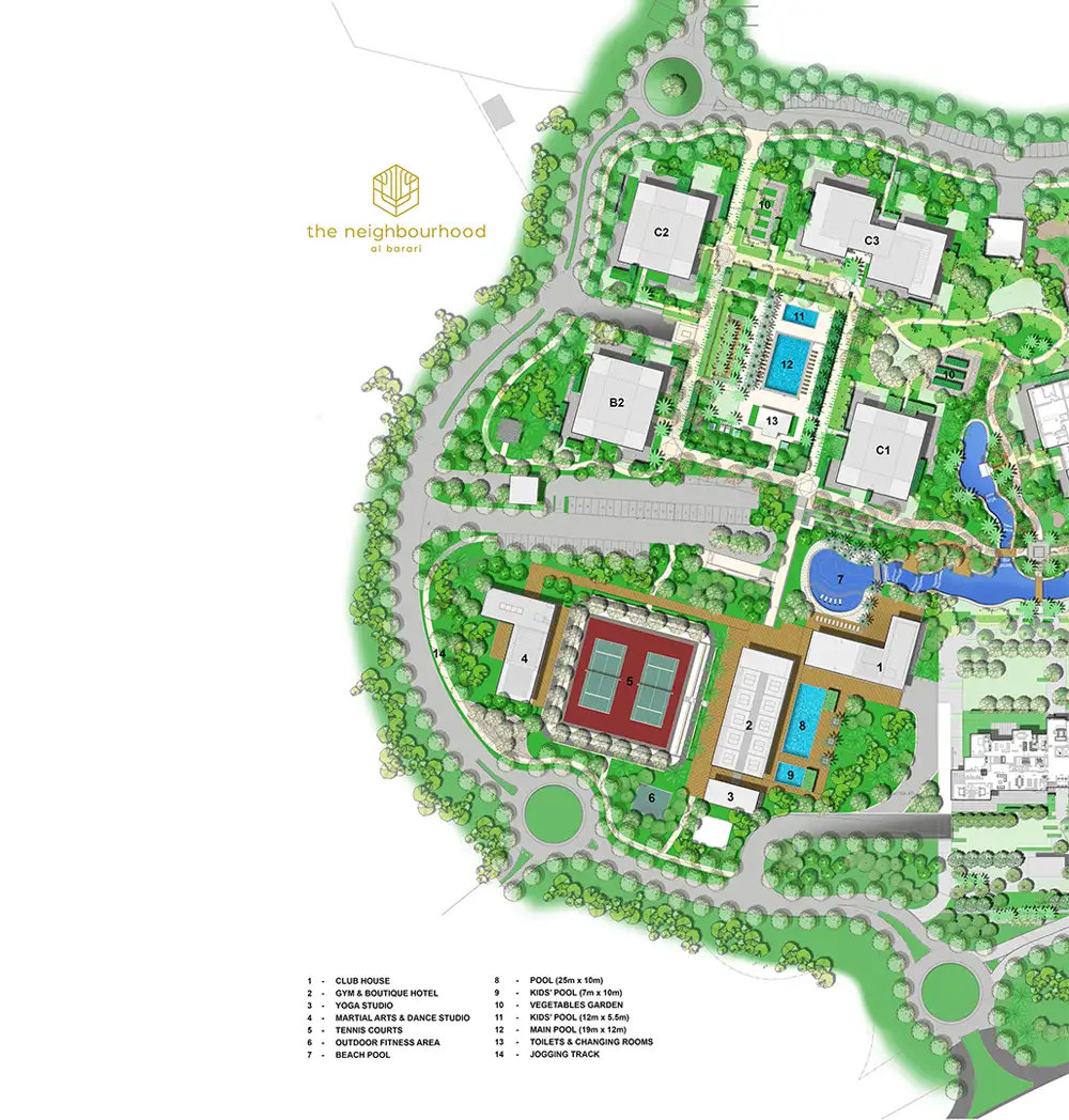 The Neighbourhood is a compact residential concept with a great investment opportunity in the heart of Al Barari. The Neighbourhood offers high rental income. It offers studio, 1-bedroom and 2-bedroom apartments with views from the fifth and sixth floors over the treetops, the desert landscape and beyond to the Dubai skyline.