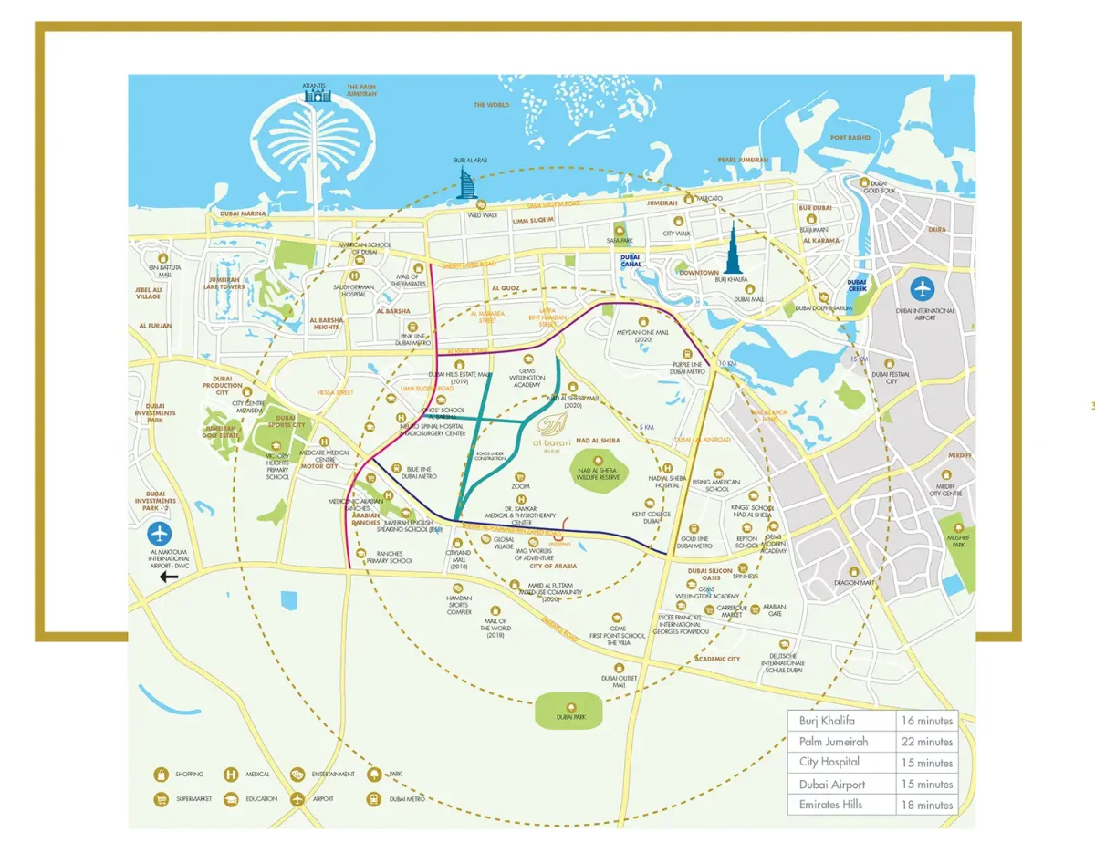 Intentionally located just 15 minutes from Dubai's true social centers and amenities: Downtown Dubai, DIFC, Dubai Marina, Palm Jumeirah and, in addition, both Dubai Airport terminals. The complex is minutes from some of Dubai's finest rehabilitation facilities and schools, including Kings' School, Repton and Lycee Francais International Georges Pompidou.