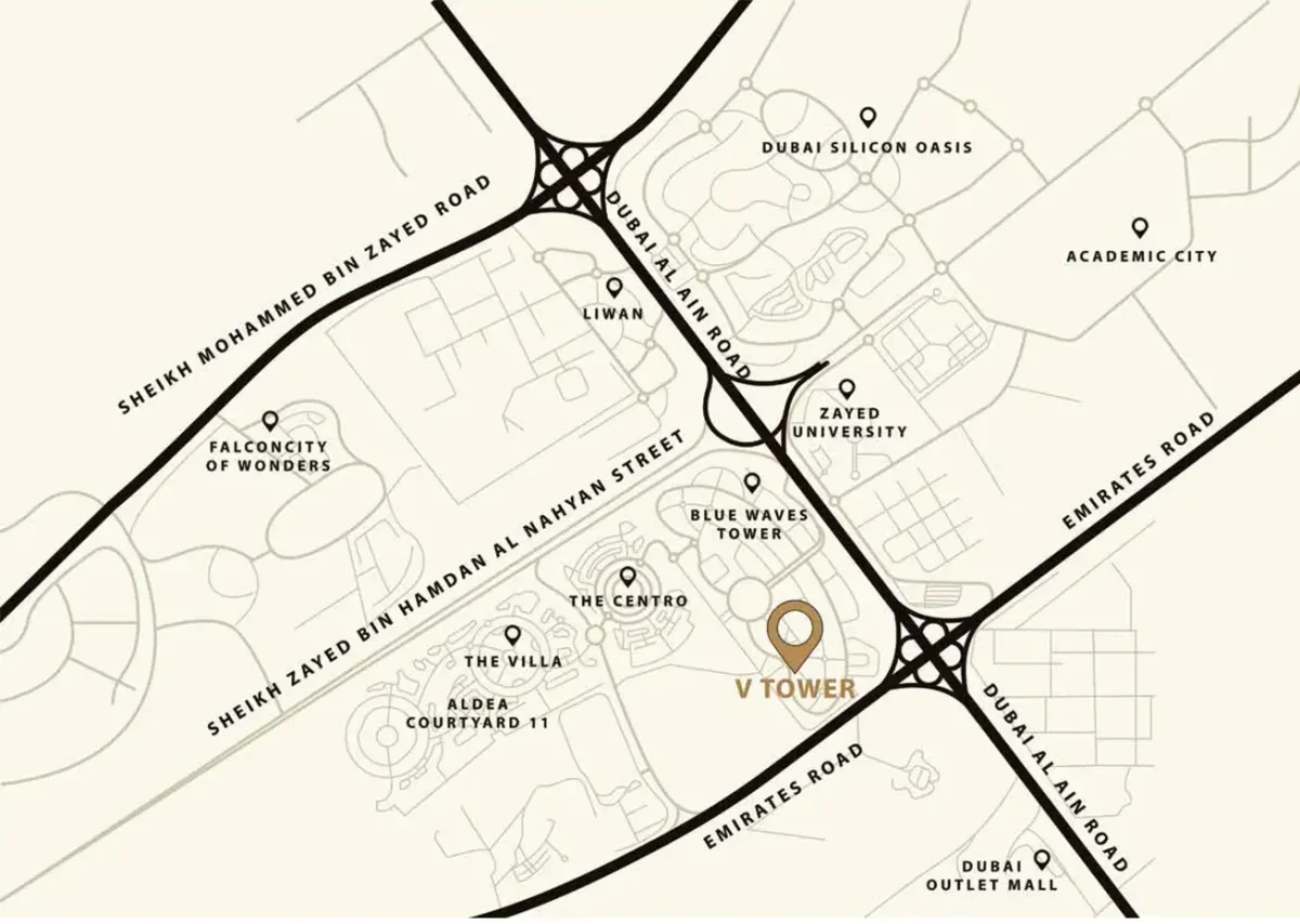 V Tower Apartments is located in the most sought-after location of the Dubailand Residence Complex and close to Dubai Al Ain Road, which offers unobstructed access to easily accessible roads and streetcars. It offers easy access to the nearby road network via Dubai-Al Ain Road and Emirates Road, while easily connecting to Sheikh Mohammed Bin Zayed Road.